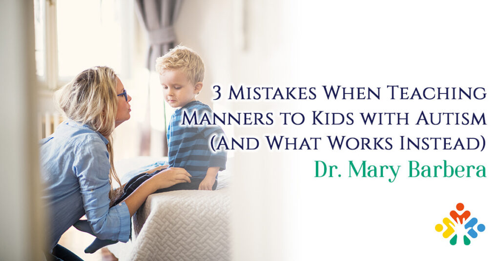 Don’t know what manners to teach kids? There are three common mistakes parents and professionals make when teaching a child with autism manners. It can feel natural to prompt a child with “Say ‘Thank you!’”, but for a child with autism, the timing of when manners are taught matters just as much as the language ability of the child and the prompts that are used to elicit language.